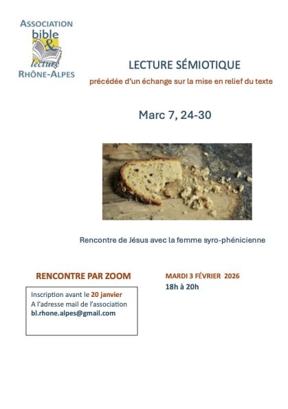 le passage de Marc 7, 24-30 le mardi 3 février 2026 de 18h à 20h, en visio.
